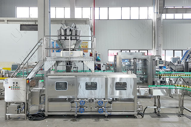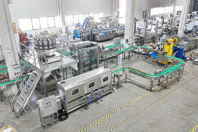 鼓泡清洗-預(yù)煮—振動(dòng)瀝水——固體物灌裝——液體灌裝——封口機(jī)——實(shí)罐清洗——稱重檢測(cè)——自動(dòng)封箱